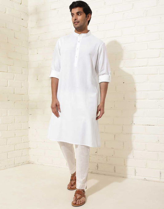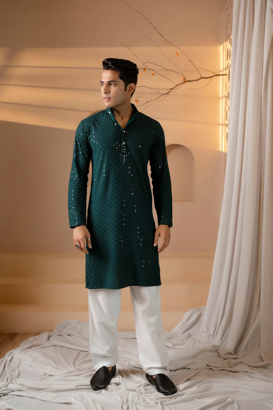 Bare Essential Lakhnavi Chikankari Sequin Work Cotton Kurta For Men Bottle Green