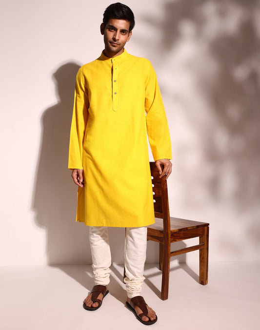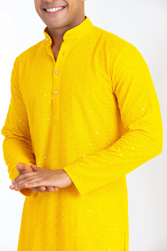 Bare Essential Lakhnavi Chikankari Sequin Work Cotton Kurta For Men Haldi Yellow